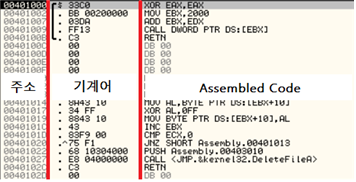 | 섹션 | 주소 | 어셈블리 코드 | 레지스터 |