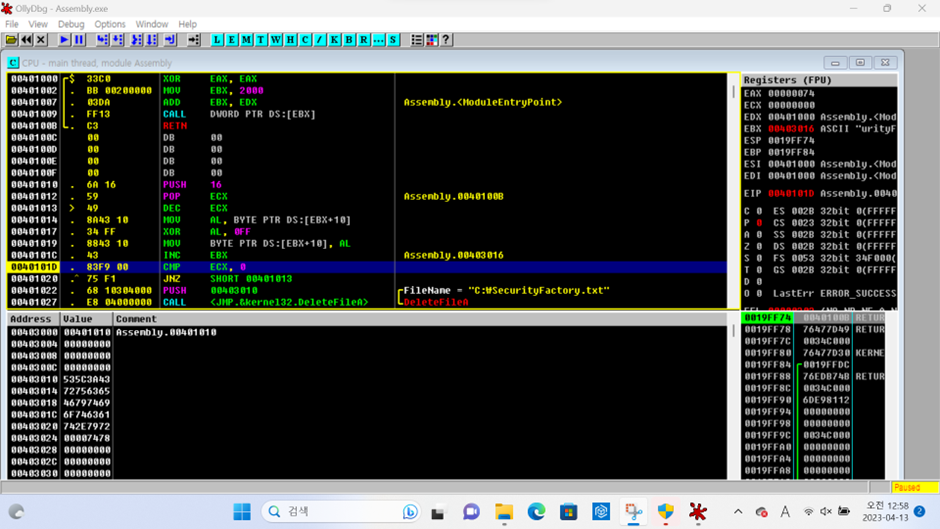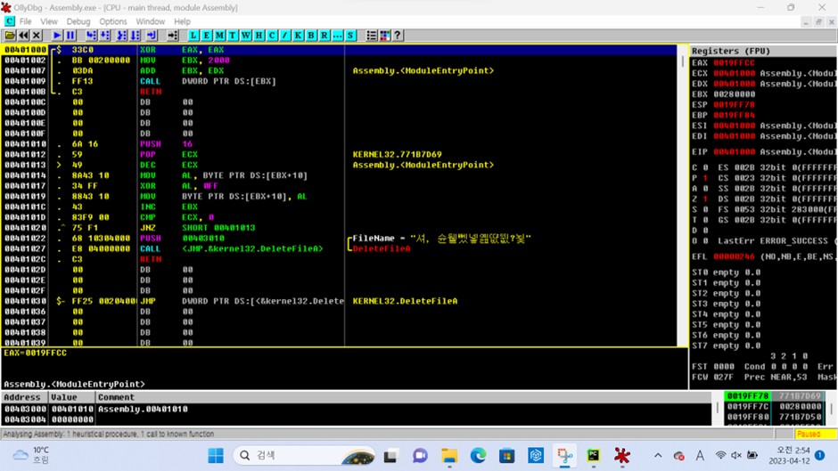 - Assembly.00401010이 새로 등장했다.