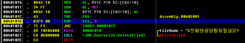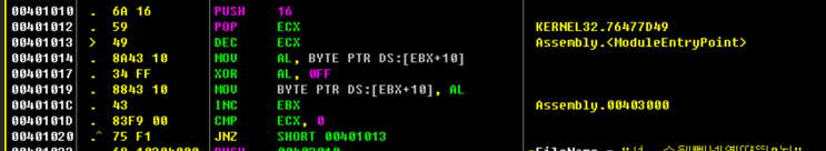 => 먼저 16을 스택에 쌓고, 이거를 다시 ECX 레지스터에 넣는다. 00401013부터 00401020까지 반복동작을 하는데 이것이 복호화 코드다.