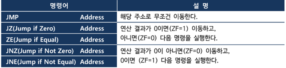 - JE(Jump if Equal) : 연산 결과가 0이면(ZF=1) 이동하고, 아니면(ZF=0) 다음 명령을 실행한다.