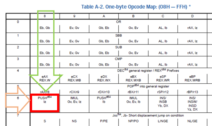 - 0x68은 PUSH 명령어이고, 오퍼랜드로 Iz 타입 값을 가진다.