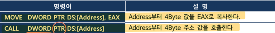 ※대괄호 ‘[ ]’는 주소값, PTR은 기준, DWORD는 크기값이다.