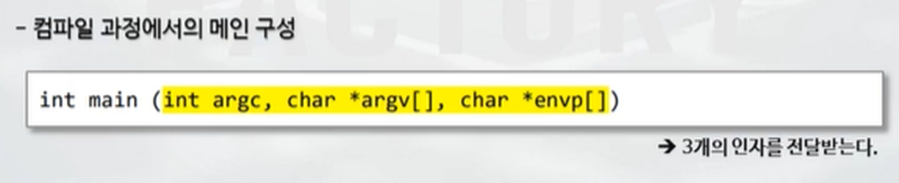 7. 메인함수의 원형은 인자와 환경변수정보를 같이 전달받는다. 그리고 컴파일 과정에서는 사용자가 어떻게 작성하더라도 원형으로 전달받음. (3개의 인자)