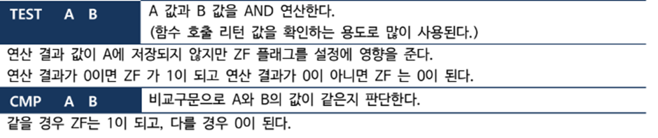 - JE(Jump if Equal) : 연산 결과가 0이면(ZF=1) 이동하고, 아니면(ZF=0) 다음 명령을 실행한다.