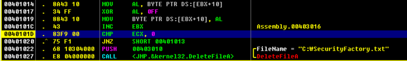 => 먼저 16을 스택에 쌓고, 이거를 다시 ECX 레지스터에 넣는다. 00401013부터 00401020까지 반복동작을 하는데 이것이 복호화 코드다.