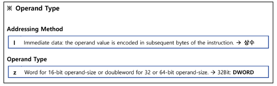 - Operand타입표를 보면, Iz는 4바이트 상수 값을 의미한다.