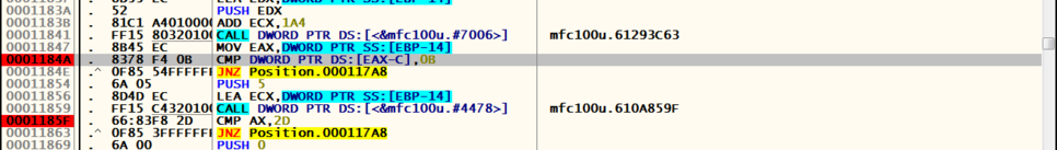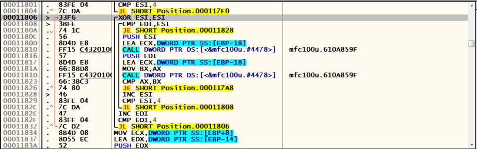 1. [ECX-C] 값과 4를 비교한 후 같으면 Position.000117D9로 점프한다.