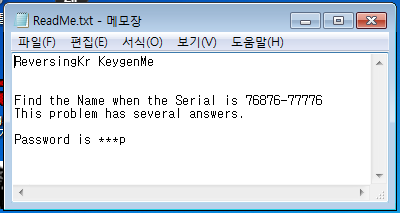 ReadMe.txt 파일을 보면 시리얼 번호가 76876-77776일때 name을 찾고 password를 찾는 문제임을 알 수 있다.