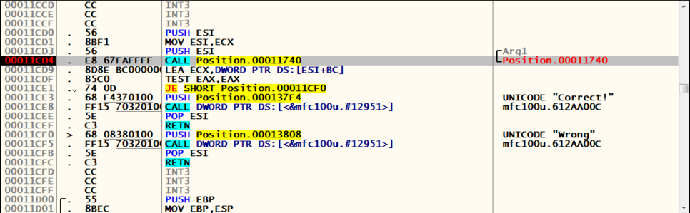 Position.00011740 함수를 호출하고 결과에 따라 Correct와 Wrong으로 분기되는 것을 볼 수 있다.