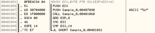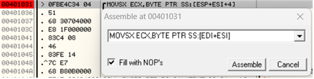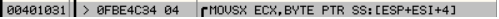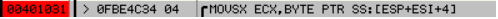 - 00401031 주소의 코드(MOVSX ECX,BYPE PTR SS:[ESP+ESI+4])를 확인한다.