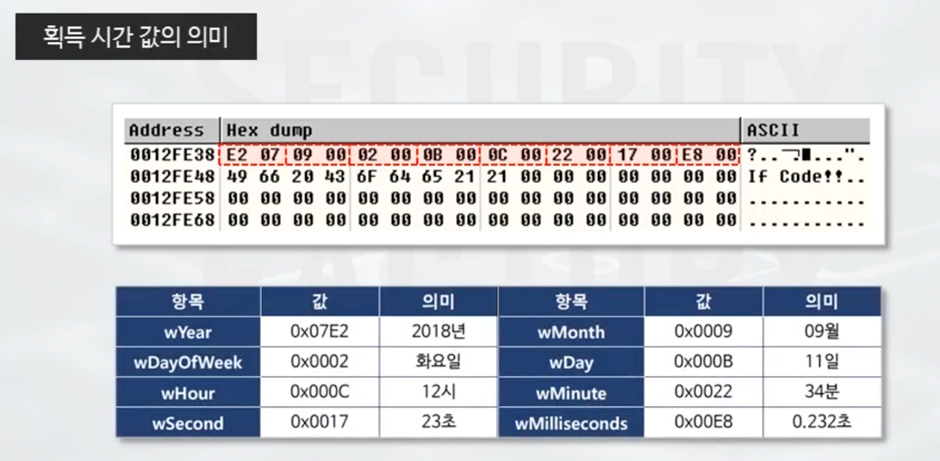 ▲ GetLocalTime()은 현재의 날짜와 시간 정보를 얻을 수 있는 API이다. 인자로 들어온 LPSYSTEMTIME에 시간 정보가 들어온다. SYSTEMTIME은 연, 월, 요일같이 다양한 시간 정보를 담을 수 있게 구성되어 있다. 이 API를 호출하고 나면 구조체에 시간 정보가 들어가는 것이다.