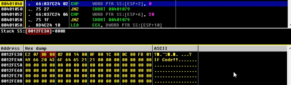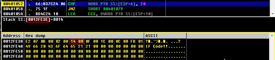 → ESP+2에서 HEX를 00 00으로 변경, ESP+6에서 HEX를 20 00으로 변경한다.