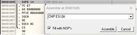 7. 00401045 주소의 코드(CMP ESI, 14) 수정하기