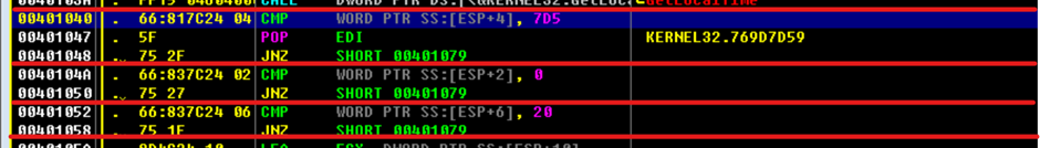 → ESP+4에 있는 두 바이트 값과 7D5를 비교하는 코드