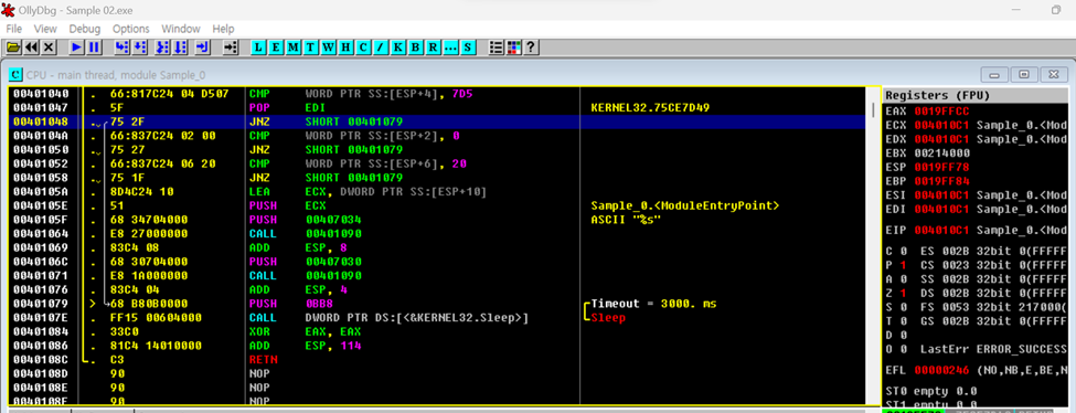 ▲ Sampe02.exe 파일을 디버거에 올리고 메인 함수로 이동한다. 한 줄 씩 실행하다 보면 00401048 주소에서 점프를 뛰고 3초 뒤에 메인 함수가 종료되는 것을 확인할 수 있다.