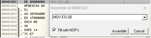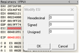 - [F2]를 눌러 Sample 03.exe를 다시 실행한 후 ESI 레지스터에 저장하는 값을 0으로 바꾼다. (NOP으로도 수정 가능)