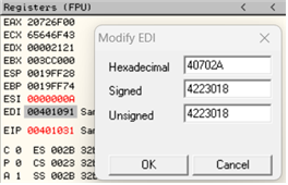 8. 다음, [EDI + ESI]가 0x407034 주소를 가리키게 한다. 그러나, ESI 레지스터에는 값 “A” 가 들어가 있으므로, 0x407034에서 0xA를 뺀 값인 0x40702A의 값을 넣는다.