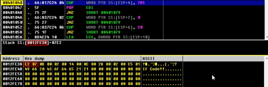 → ESP+4에 있는 두 바이트 값과 7D5를 비교하는 코드