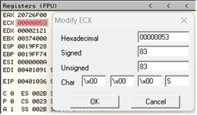 - 00401036 주소의 ECX 레지스터에 대문자 “S”의 아스키코드 값을 넣는다.
