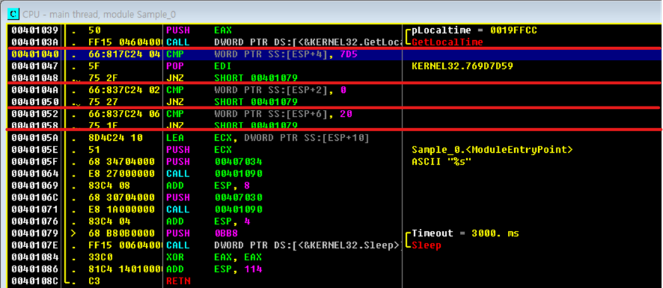 | 문제 해결 방안 - GetLocalTime() 함수 호출 결과, 입력되는 시간 정보를 수정한다. - 대조군에 해당하는 값인 0x07D5, 0x00, 0x20을 적절히 수정한다. - CMP 명령어 실행 결과, 0으로 설정되는 ZF 레지스터 값을 1로 수정한다. - 비교 결과에 대한 실행 코드인 ‘JNZ 조건 점프’를 반대로 동작하게 만든다. |
