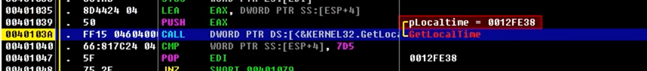 ▲ 0040103A 지점에서 ‘GetLocalTime’을 호출한다. 여기에 0012FE38이 인자값으로 들어간다. 그리고 실행하면 값이 들어온다.