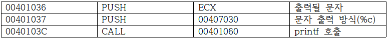 → 00401048 ~ 00401076 사이에 문자 출력 코드가 있을 것으로 예상할 수 있다.