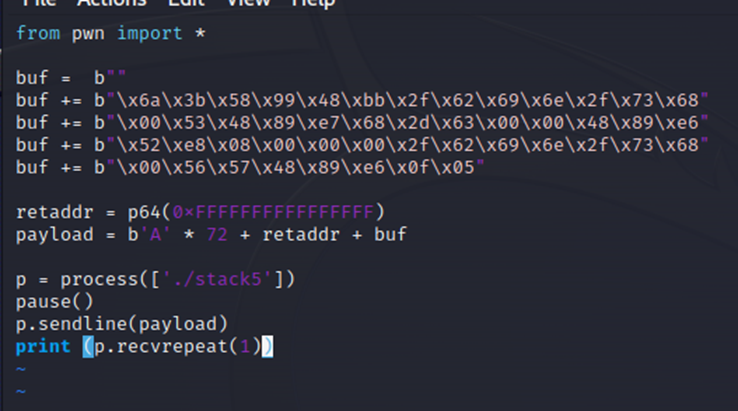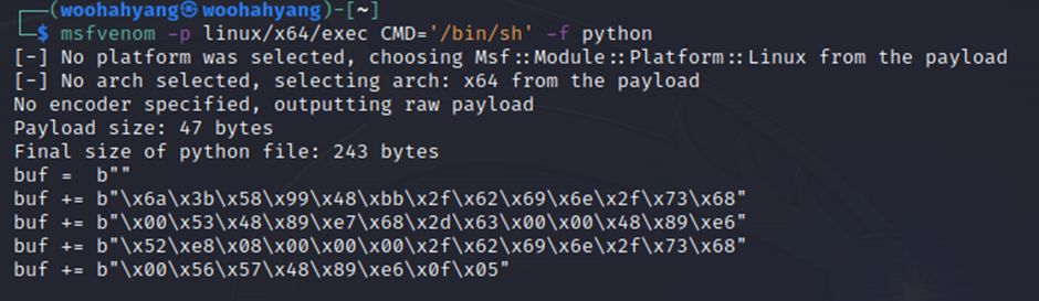 - CMD로 실행할 bin쉘을 옵션을 주고 f 옵션을 통해 파이썬을 출력 포맷으로 정한다.