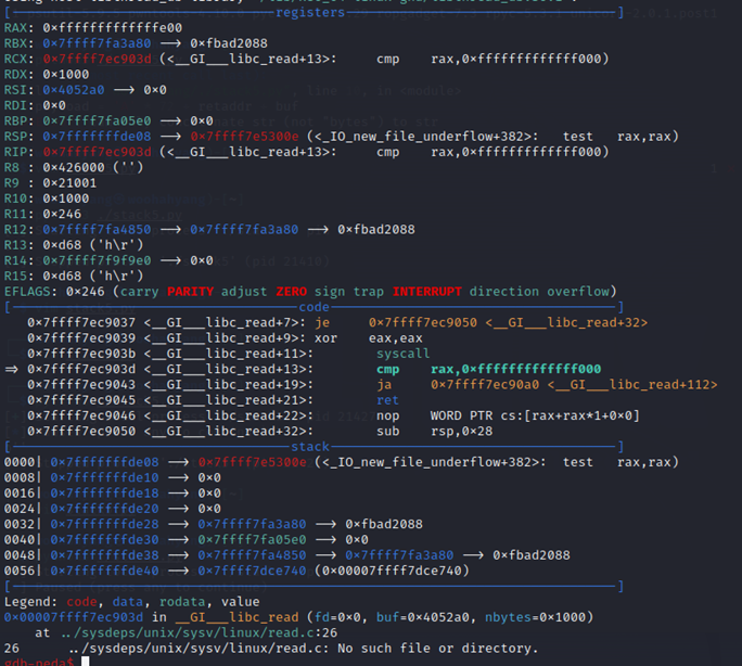 - pid 값(실행때마다 바뀜)을 넣어 멈춘 상태에서 gdb를 실행한다.