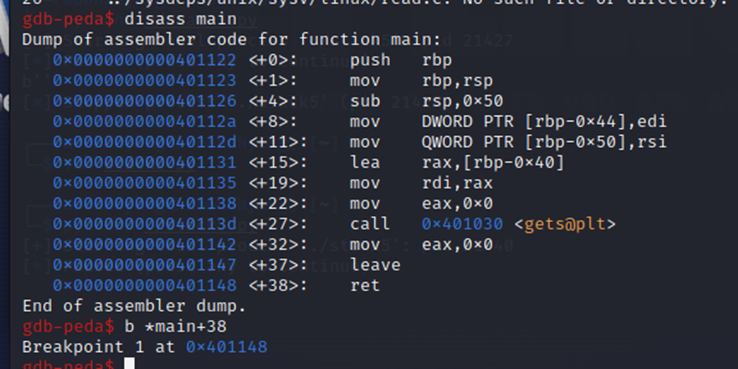 3. 디버깅 하고 싶은 부분이 break를 건다. (b *main+38)