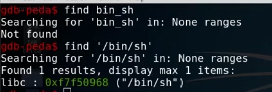 - find '/bin/sh'을 통해 bin쉘의 위치를 찾는다. (0xf7f50968)