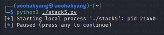 5. pwn 프로그램에 엔터를 누른다. (sendline 실행됨)