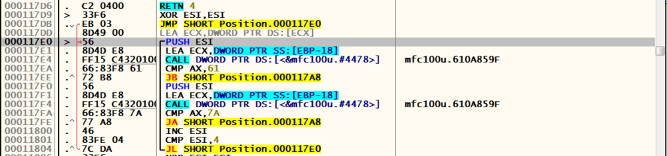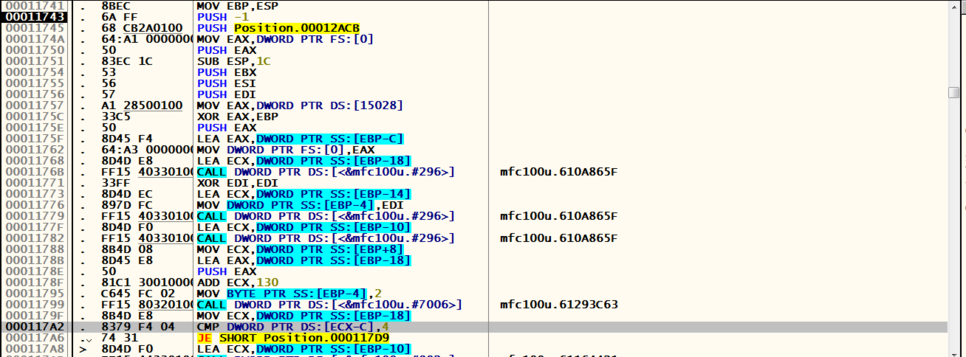 1. [ECX-C] 값과 4를 비교한 후 같으면 Position.000117D9로 점프한다.