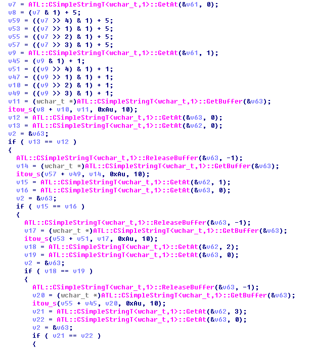 GetAt(&v61, 0)에서 v61은 password이므로 한자리씩 가져와서 shift연산, and 연산을 통해 입력한 시리얼 값과 비교한다.