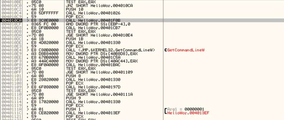 이후 CALL KERNEL32.GerCommandLineW 명령어를 발견하였다