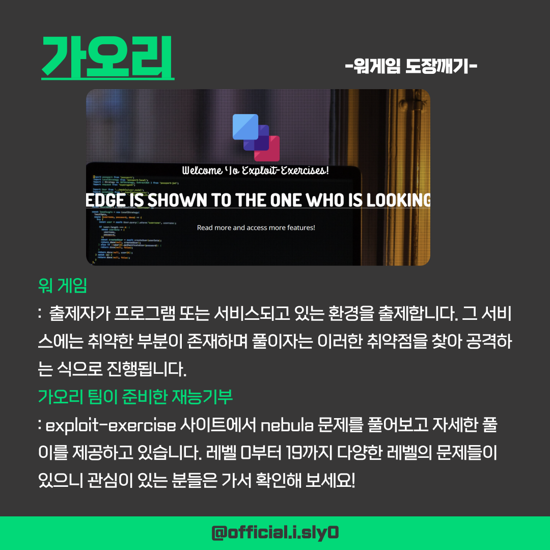 I.Sly()는 웹 해킹, 리버스엔지니어링, 시스템 해킹 등 다양한 해킹 분야에서 기본 소양 및 심화 내용을 공부하며 화이트 해커 양성을 목표로 활동하는 해킹 동아리입니다.