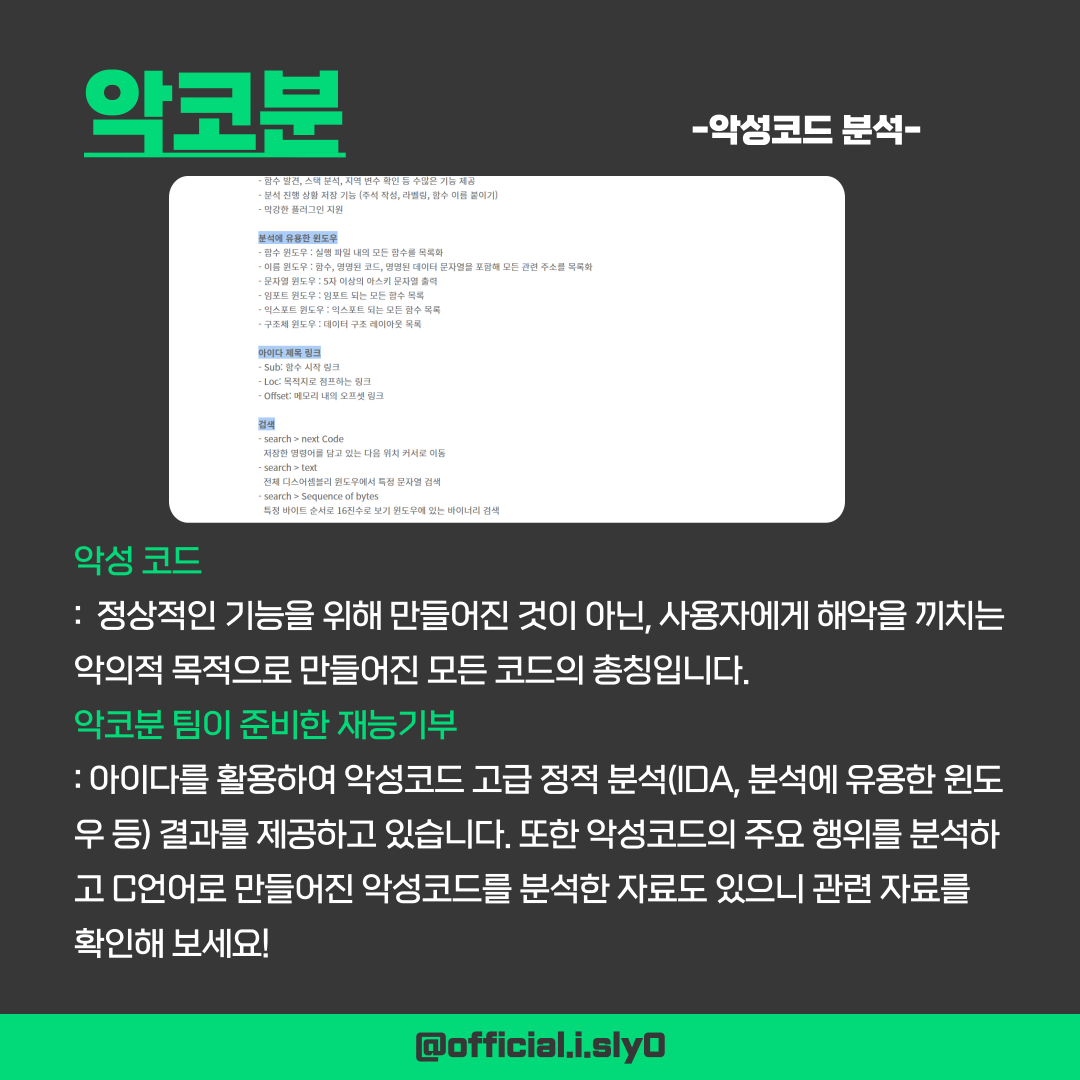 정적 분석, 고급 정적 분석을 이용해 악성 코드를 분석하여 제공하고 C언어로된 악성코드를 분석한 자료도 제공합니다.