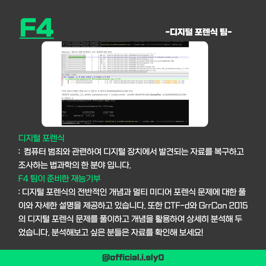 디지털 포렌식의 개념과 다양한 디지털 포렌식 문제를 풀이하고 분석하고 있습니다. 또한 파일 시그니처 분석 툴도 제작하였습니다.
