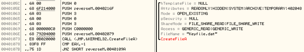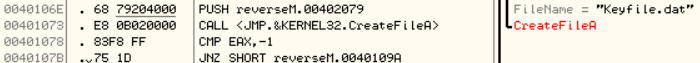 만약, “Keyfile.dat” 파일이 없으면 EAX에 -1를 저장해 [0040107B]에서 점프를 하지 않고, 파일이 있으면 점프를 한다.