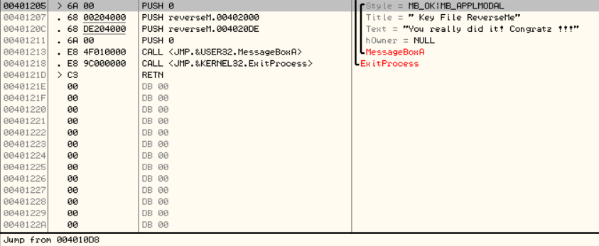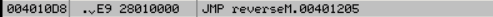 그러면 [004010D8] 주소에 도착할 수 있고, [00401205] 주소로 점프하게 된다.