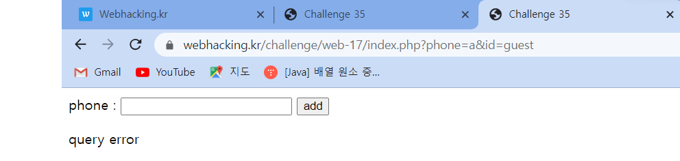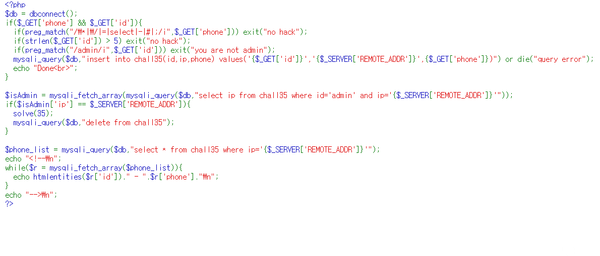insert into chall35(id, ip, phone) values('{$_GET['id']}','{$_SERVER['REMOTE_ADDR']}',{$_GET['phone']}) 의 쿼리를 통해 내가 입력창에 번호를 입력하면 guest와 내 ip주소가 같이 들어가게 된다.