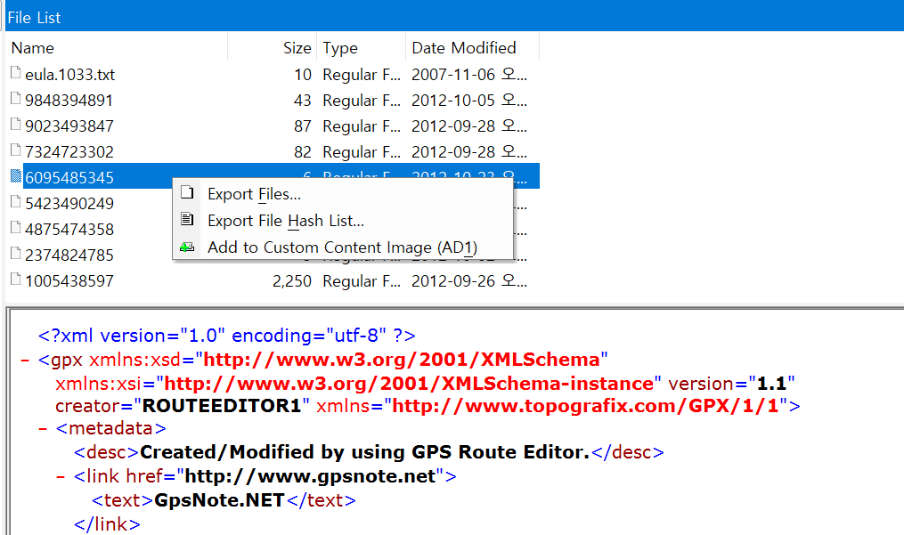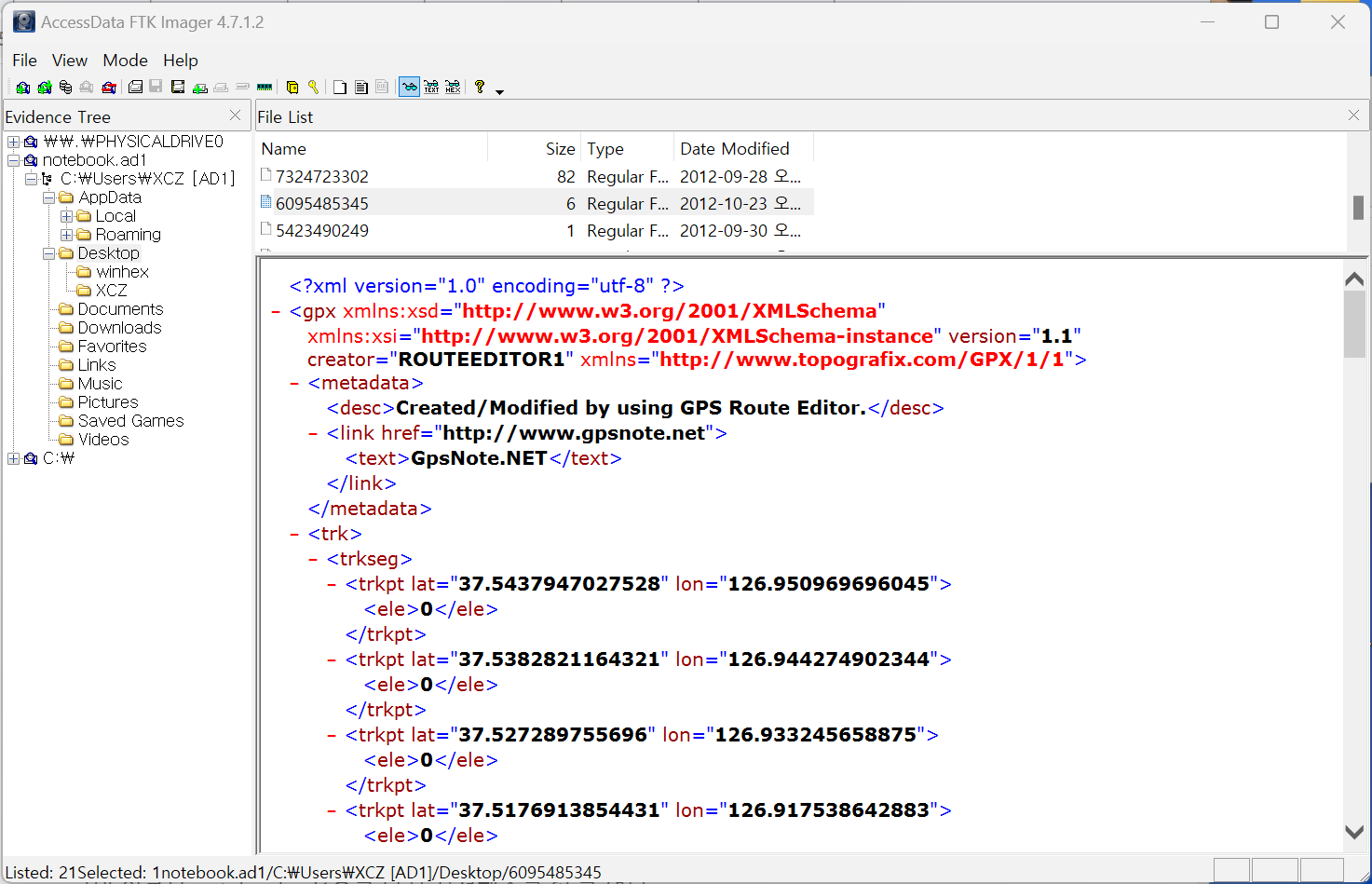 그중 Desktop 폴더 아래 6095485345라는 파일이 있다. Created/Modified by using GPS Route Editor라고 중간에 써져 있다. 밑에 위도, 경도 정보가 있는 것도 확인 가능하다.