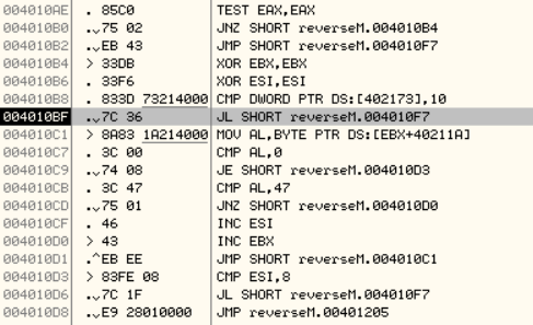 그 후 다시 차례대로 실행해보면, [004010D6] 주소에서 2번째 JL문이 나오는데 앞에서 했던 것과 동일하게 S플래그의 값을 1에서 0으로 바꿔준다.