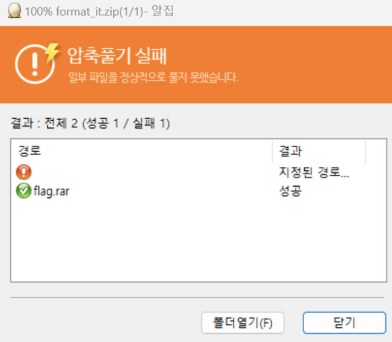문제에서 다운받은 format_it.zip 파일의 압축을 풀어봤는데, ‘flag.rar’은 다운로드에 성공했으나 어떤 파일 하나는 압축 풀기에 실패했다.