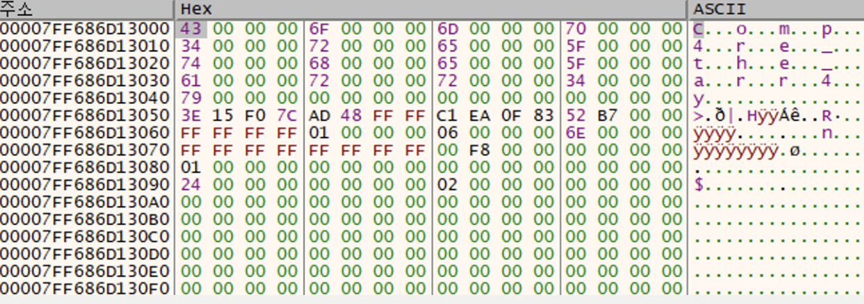 [7FF686D13000] 주소에 저장된 값을 보니 flag 값으로 예측된다.