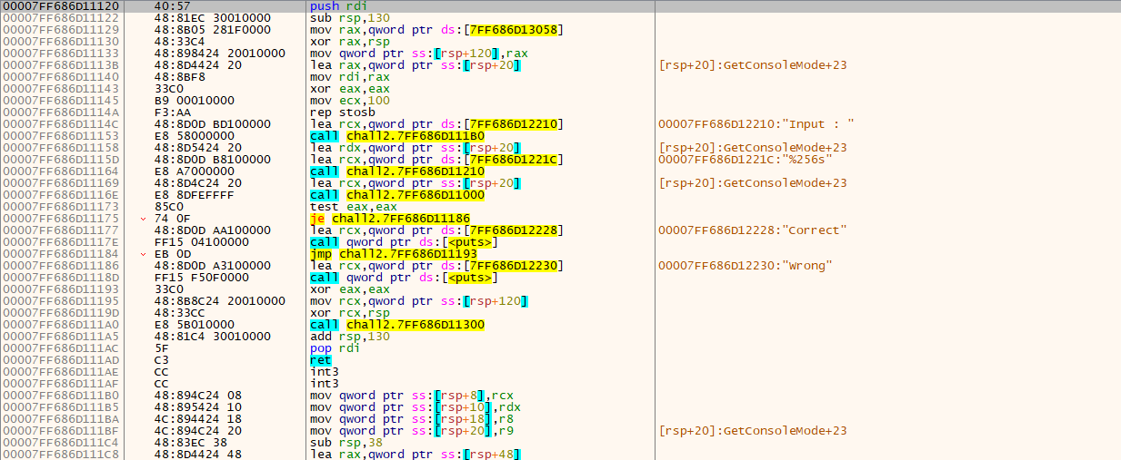 x64dbg를 이용해 코드를 확인해보면, [00007FF686D1150F] 주소에서 “Input :” 문자열이 출력되는 것을 확인할 수 있다.
