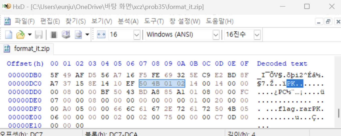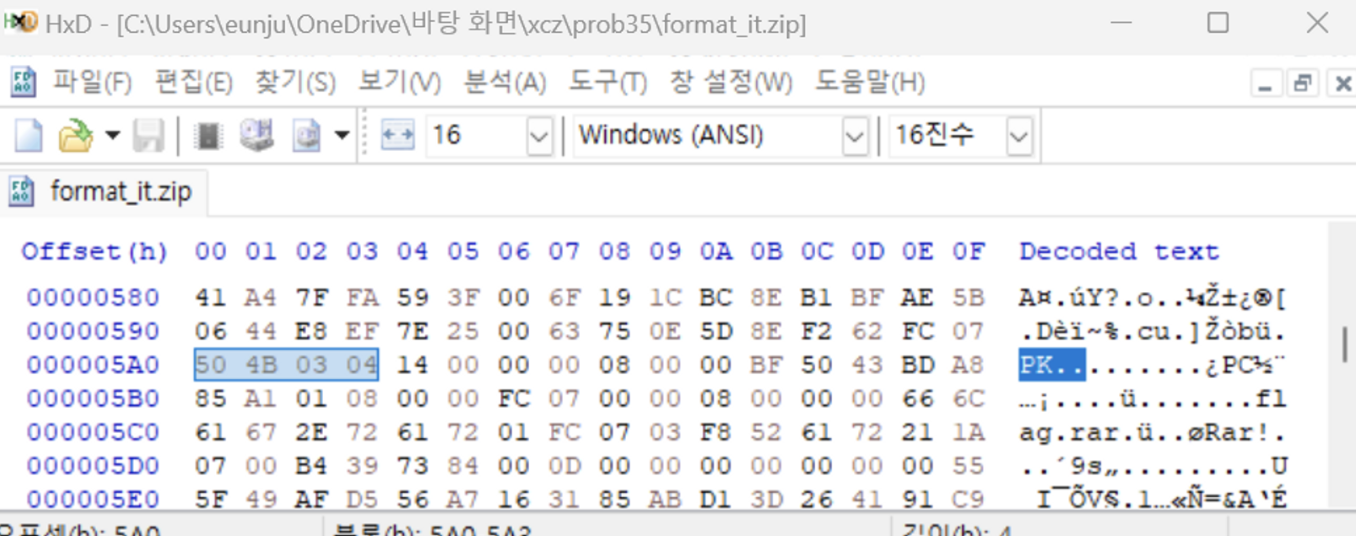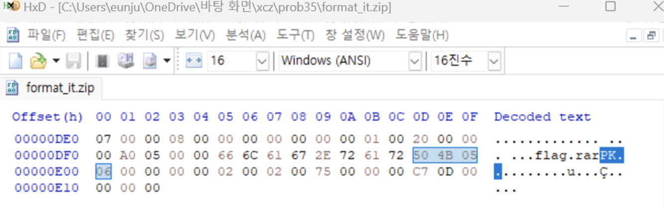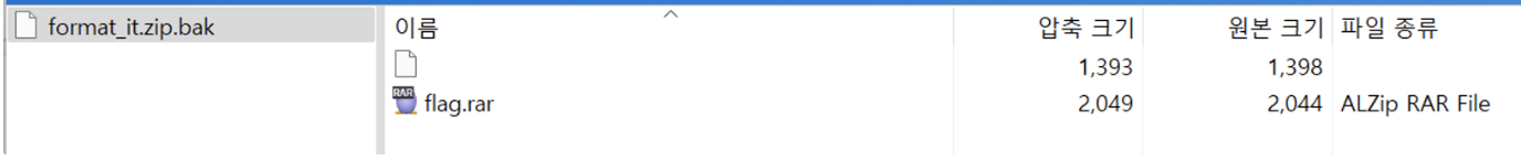 문제에서 다운받은 format_it.zip 파일의 압축을 풀어봤는데, ‘flag.rar’은 다운로드에 성공했으나 어떤 파일 하나는 압축 풀기에 실패했다.