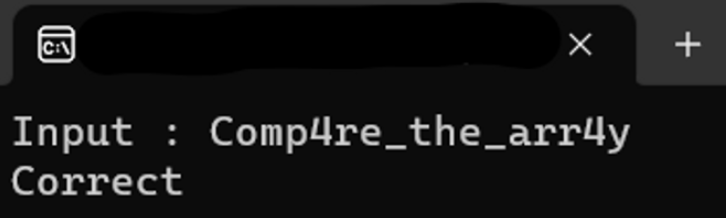문자열을 모두 변환하면, flag 값을 얻을 수 있다. 이를 입력하면 “Correct” 문자열이 성공적으로 출력된다.