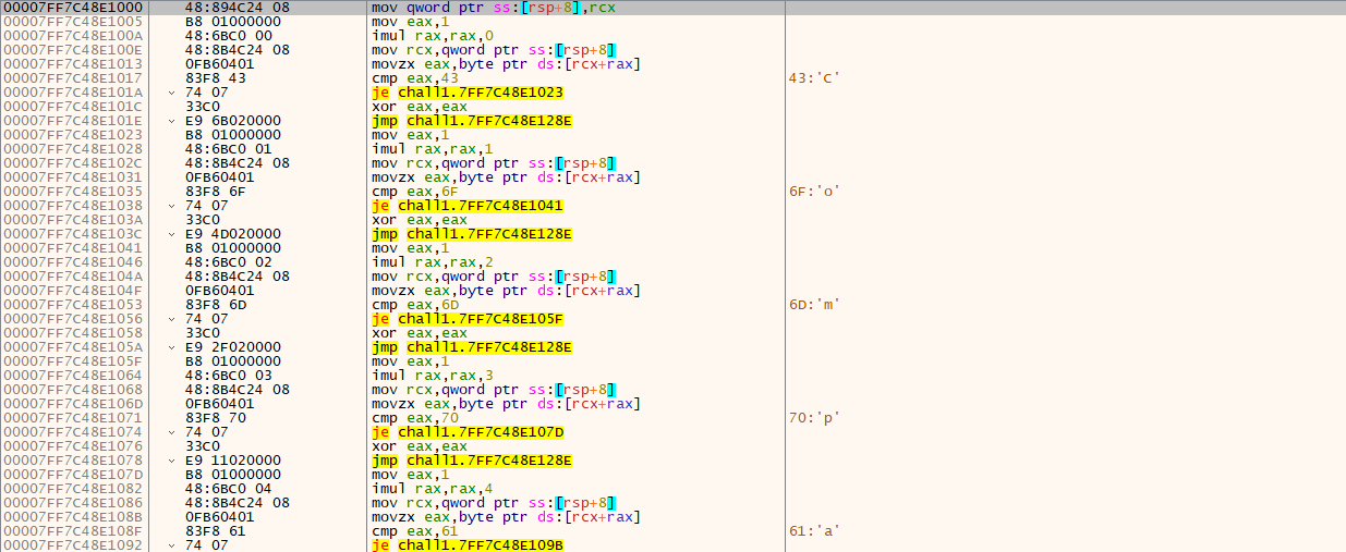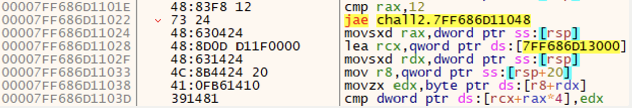 코드를 확인해보면 rax랑 12를 비교하는 것을 알 수 있다. 12번 반복하면서 문자열을 비교하는 것 같다. 그 후, 두 번째 cmp 명령어에서 [rcx+rax*4]의 값과 edx를 비교하는 것을 볼 수 있다.