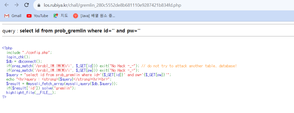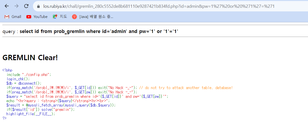 - $query = "select id from prob_gremlin where id='{$_GET[id]}' and pw='{$_GET[pw]}'"; 해당 쿼리문은 id와 pw 둘 중 하나를 참으로 만들어주면 해당 쿼리문을 우회할 수 있다.