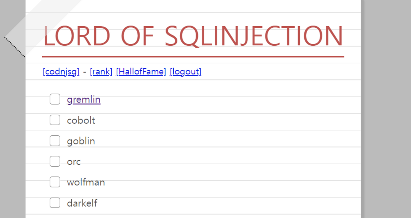 - LORD OF SQLINJECTION사이트의 gremlin문제